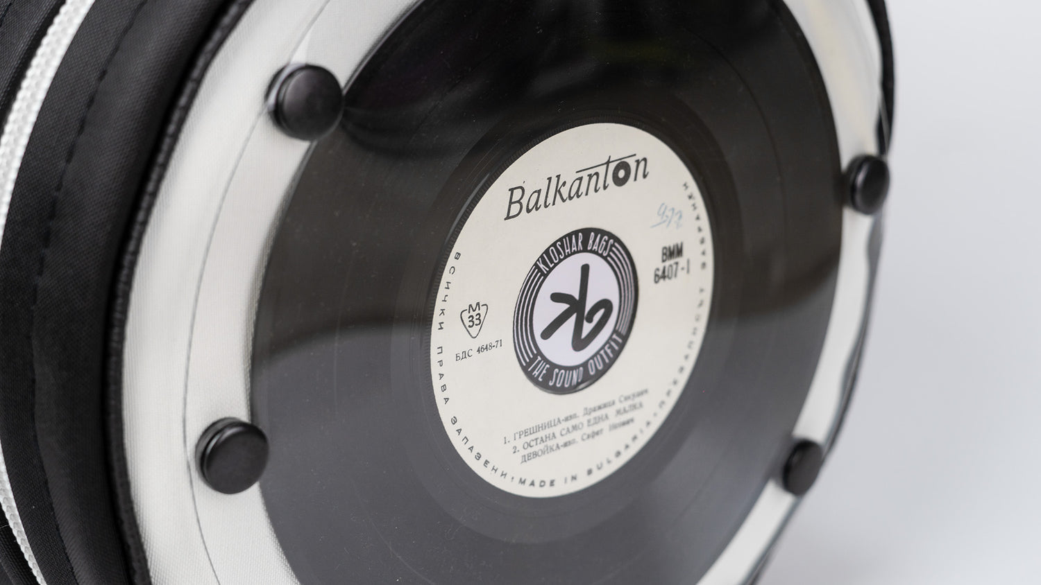 eco leather / cotton fabric inside / vinyl / 7 inch authentic BALKANTON vinyl record / zipper / stainless steel emblem / plastic eyes decoration