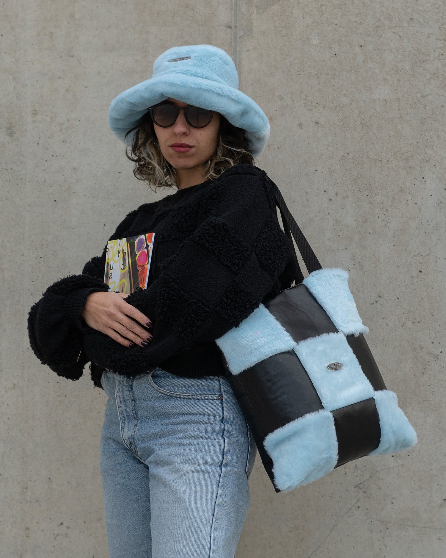 BAG: faux fur - black eco leather - cotton fabric inside - stainless steel emblem - belt