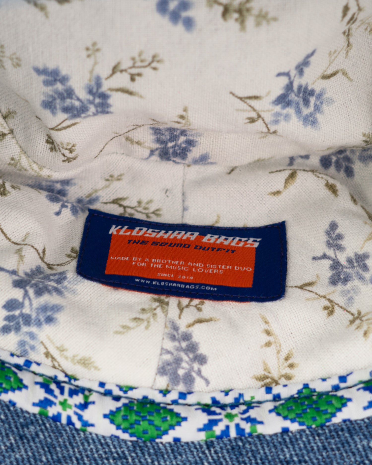 recycled denim fabric- flora cotton fabric - stainless steel emblem