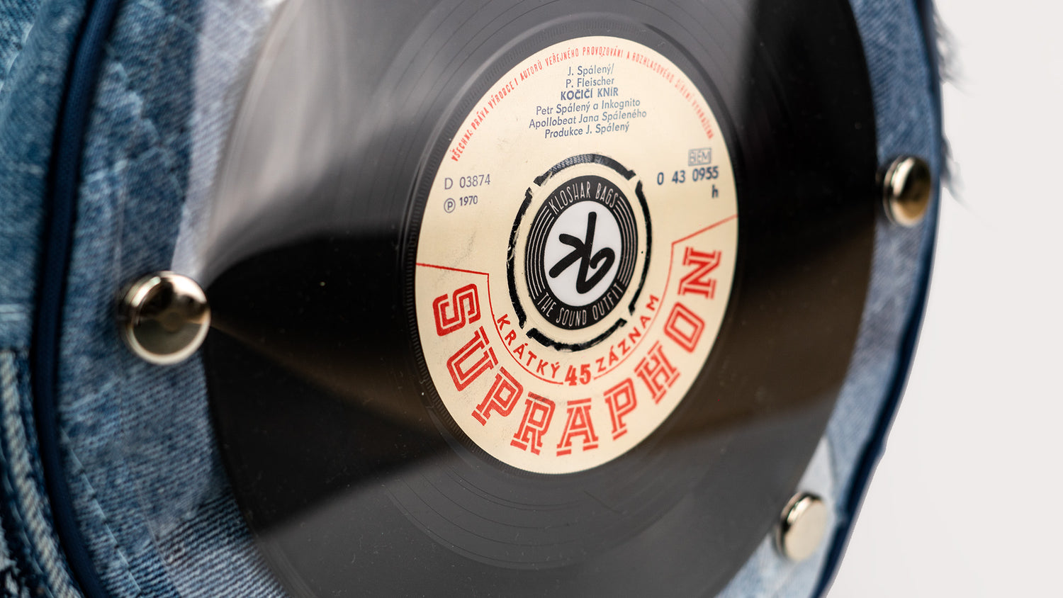recycled denim fabric / cotton fabric inside / vinyl / 7 inch authentic SUPRAPHON vinyl record / zipper / stainless steel emblem / decoration of plastic eyes
