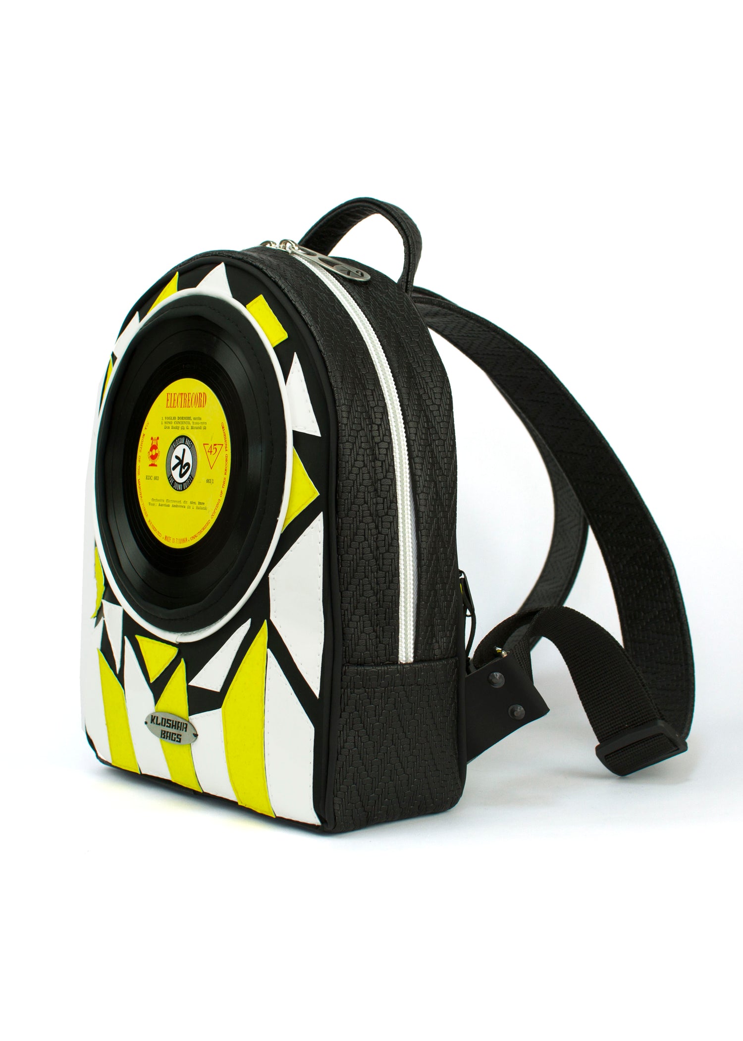 eco leather / small authentic vinyl record / 7inch / zip / polyester fabric inside / stainless steel emblem / belt