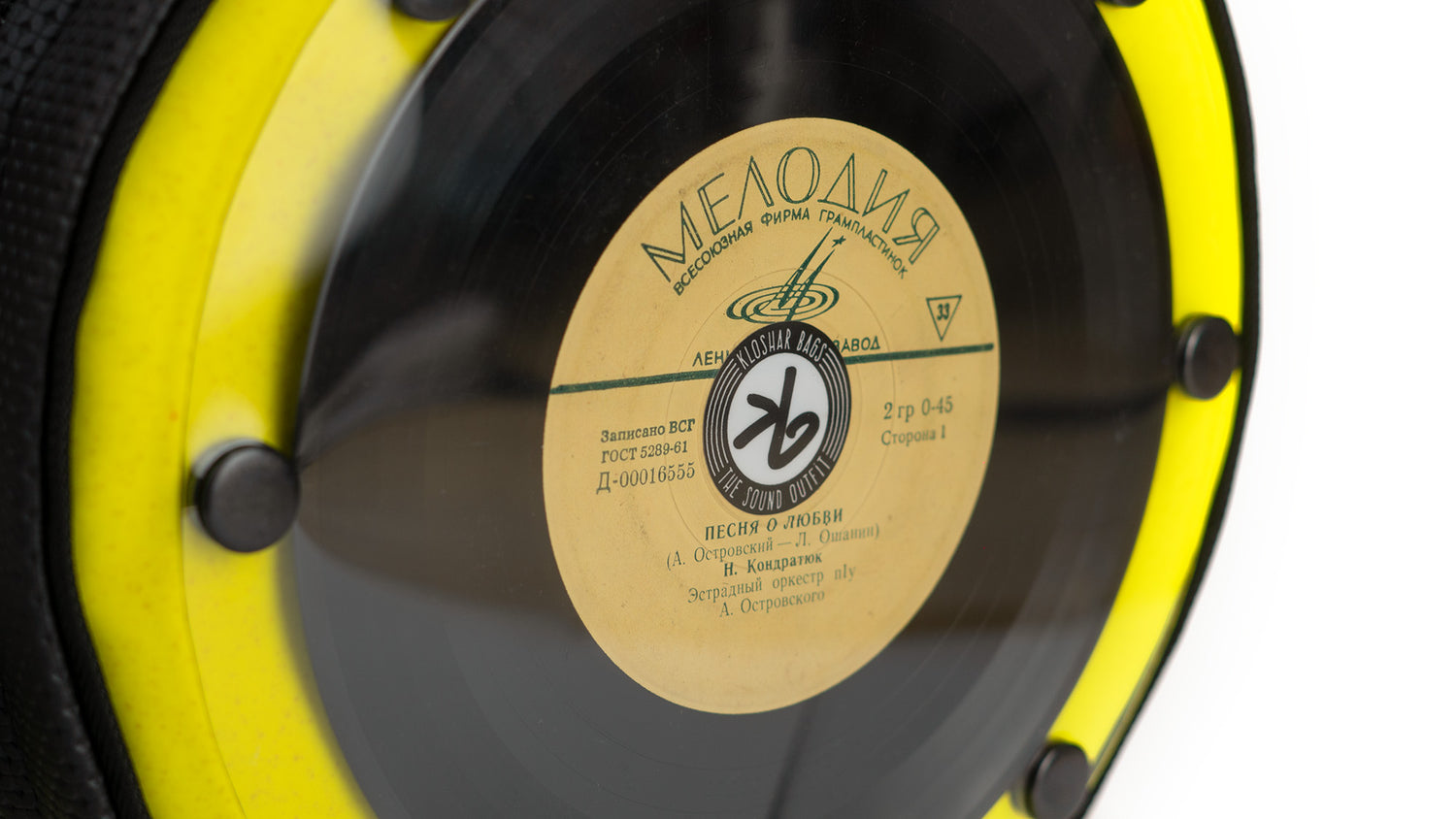 eco leather / cotton fabric inside / vinyl / 7 inch authentic MELODIA vinyl record / zipper / stainless steel emblem / decoration of plastic eyes